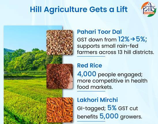 उत्तराखंड के 13 पहाड़ी जिलों में उगाई जाने वाली स्थानीय तूर दाल, लाल चावल और लखौरी मिर्च जैसे उत्पादों पर अब 18% या 12% से घटाकर 5% जीएसटी लागू किया गया है। इस निर्णय से छोटे किसानों और जैविक उत्पादकों को सीधा लाभ मिलेगा।