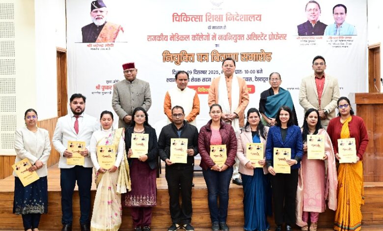 देहरादून: उत्तराखंड सरकार ने राज्य में स्वास्थ्य शिक्षा और चिकित्सा सेवाओं को सुदृढ़ बनाने की दिशा में एक बड़ा कदम उठाते हुए मंगलवार को 142 नवनियुक्त असिस्टेंट प्रोफेसर्स को नियुक्ति पत्र प्रदान किए। देहरादून स्थित मुख्य सेवक सदन, मुख्यमंत्री आवास में आयोजित इस विशेष कार्यक्रम में मुख्यमंत्री पुष्कर सिंह धामी ने स्वयं नियुक्ति पत्र वितरित किए और युवाओं को चिकित्सा क्षेत्र में नई भूमिका निभाने के लिए शुभकामनाएं दीं।