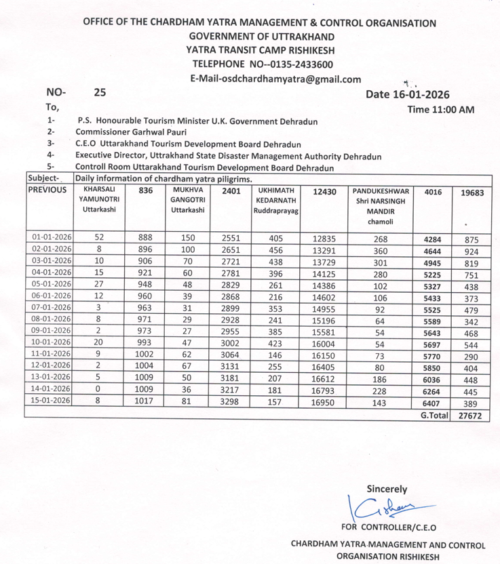 उत्तराखंड चारधाम यात्रा मैनेजमेंट कार्यालय से प्राप्त आधिकारिक आंकड़ों के अनुसार, शीतकालीन यात्रा की शुरुआत (24 अक्टूबर 2025) से लेकर 15 जनवरी 2026 तक कुल 27,672 श्रद्धालु चारों धामों के गद्दीस्थलों पर शीश नवा चुके हैं। यह आंकड़ा न केवल पर्यटन विभाग के लिए उत्साहजनक है, बल्कि स्थानीय अर्थव्यवस्था के लिए भी शुभ संकेत है।