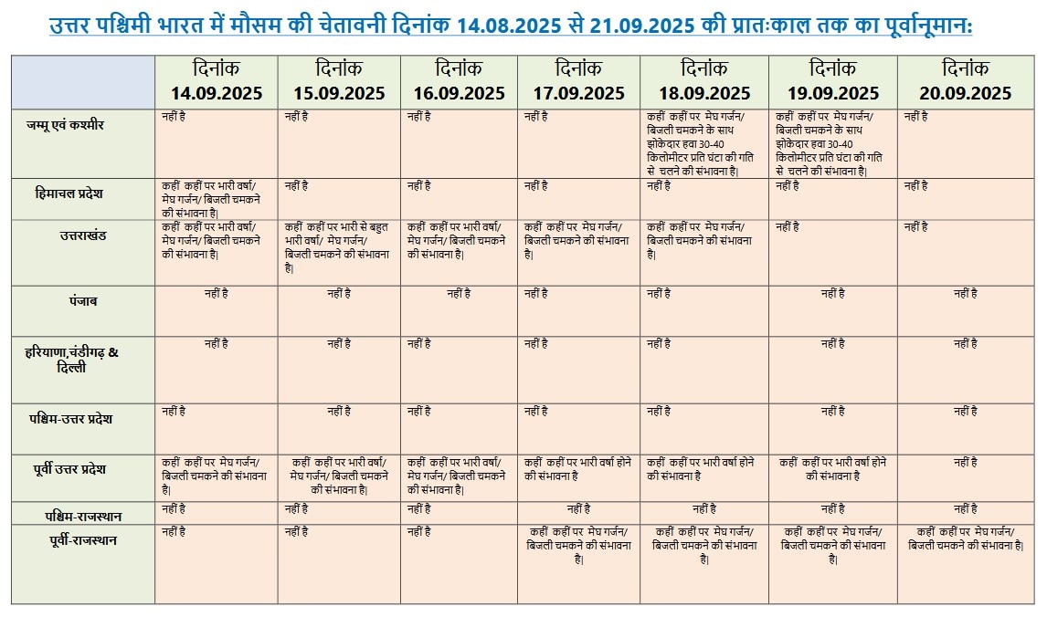 - 18 सितंबर तक कई जिलों में भारी बारिश और आंधी-तूफान की संभावना जताई गई है।
